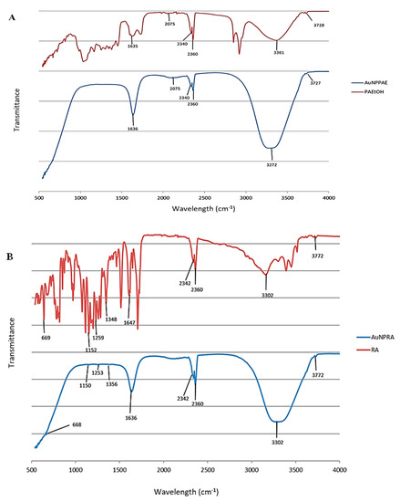 Major absorption bands for rosmarinic acid (RA) and AuNPRA were observed at 3302 cm−1, which could be assigned to O-H stretching and 1647 cm−1 and 1636 cm−1 assigned to C=C stretching for RA and AuNPRA, respectively. Minor peaks were observed at 1348 cm−1 and 1356 cm−1 assigned to O-H bending, 1259 cm−1 and 1253 cm−1 assigned to C-O stretching, 1152 cm−1 and 1150 cm−1 assigned to C-O stretching, and 669 cm−1 and 668 cm−1 assigned to C=C bending for RA and AuNPRA, respectively (Figure 1B, Table S1). These infrared bands could be attributed to the functional groups observed in the chemical structure of rosmarinic acid [30,31].