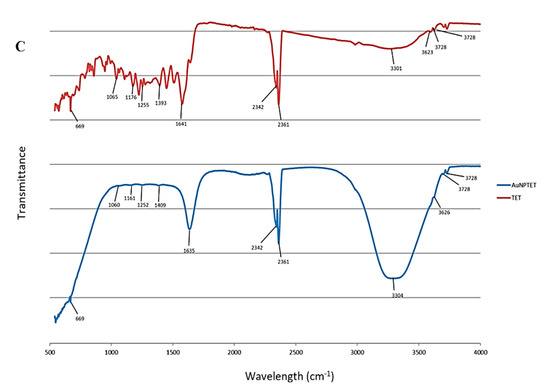 Major peaks were observed for tetracycline (TET) and AuNPTET with the FTIR spectra at 3301 cm−1 and 3304 cm−1 that could be assigned to N-H stretching 1641 cm−1 and 1635 cm−1 assigned to C = C or N-H bending. Minor peaks were observed at 1393 cm−1 and 1409 cm−1 assigned to O-H bending, 1252 cm−1 and 1255 cm−1 assigned to C-O stretching, 1161 cm−1 and 1176 cm−1 assigned to C-N stretching, 1060 cm−1 and 1065 cm−1 assigned to C-O stretching, and 669 cm−1 assigned to C = C bending for TET and AuNPTET, respectively (Figure 1C, Table S1). These infrared bands could be attributed to the functional groups observed in the chemical structure of tetracycline [30,31].