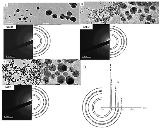 High-resolution transmission electron microscopy (HRTEM) was conducted to obtain the selected area electron diffraction (SAED) patterns, measure lattice fringes, and the overall shape of the AuNPs. Due to limited sample availability, the estimated d-spacing values were calculated from the SAED pattern for all the samples compared to the crystalline structure of Au, which represented all frequently occurring d-spacings in the crystal. The HRTEM images and SAED patterns of the gold nanoparticles AuNPPAE, AuNPRA, and AuNPTET are shown in Figure 2. Spherically shaped nanoparticles were mainly observed for AuNPPAE with some triangular shapes (Figure 2A). These spherically shaped AuNPPAE indicate a good capping and stabilisation of the AuNP by the plant extract components [32]. The HRTEM images of AuNPRA (Figure 2B) and AuNPTET (Figure 2C) confirmed that the nanoparticles were mainly spherically shaped, with some cluster formation observed. Clustering of these AuNP could be due to the functional groups capping the AuNPs. This clustering can be due to the acidic functional groups, such as carboxylic (>C=O) groups of rosmarinic acid and the basic amine functional groups of tetracycline [33]. Bright circular rings of the SAED pattern and clear lattice fringes from the HRTEM images confirmed the crystalline nature of AuNPPAE, AuNPRA, and AuNPTET. The d-spacings of the formed AuNP′s can be observed in Figure 2 compared to the simulated diffraction pattern of crystalline Au.