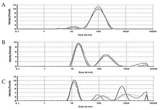 Hydrodynamic diameter of (A) P. aliciae gold nanoparticles (AuNPPAE), (B) rosmarinic acid gold nanoparticles (AuNPRA), and (C) tetracycline gold nanoparticles (AuNPTET), n = 3.