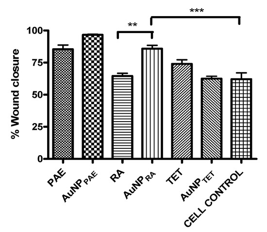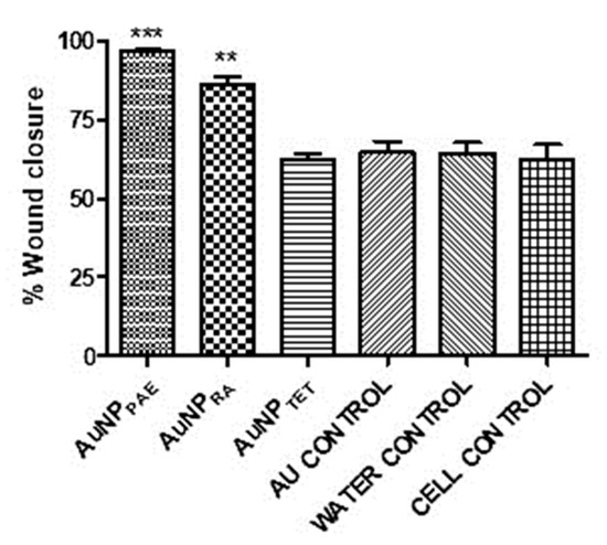 Percentage wound closure comparison between gold nanoparticle samples and their respective controls. AuNPPAE: gold nanoparticles formed from Plectranthus aliciae ethanolic extract (PAE); AuNPRA: gold nanoparticles formed from rosmarinic acid (RA); AuNPTET: gold nanoparticles formed from tetracycline (TET). One-way ANOVA followed by Tukey′s multiple comparison test, n = 3. ** p < 0.01, *** p < 0.001.