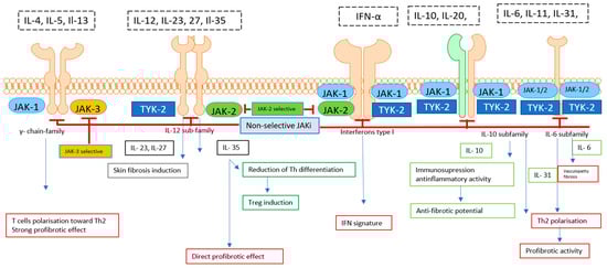 Systemic sclerosis is characterized by the activation of IL-12 cytokine family that exert a mainly profibrotic effect. Different types of receptors signalling via the JAK/STAT pathway may be potentially modulated by the inhibition of receptor-attached JAK. IL-4, IL-5, and IL-13 cytokines belonging to the γ chain receptor subfamily exert a profibrotic effect that may be blocked via JAK-1 and JAK-3 inhibitors, resulting in the reduced polarisation of Th cells toward a profibrotic Th2 response. Similarly, the IL-12 cytokines, IL-23 and IL-27, are characterized by a significant profibrotic effect. The role of the last member of the Il-12 family, IL-35, is characterized by dual pro-fibrotic and anti-fibrotic activity. Therefore, the net effect depends on which signalling pathway is predominantly blocked. JAKis can block signalling via the IFN receptor that translates to a reduction in the IFN signature (and a potential therapeutic effect). IL-10 cytokine family members exert both anti-fibrotic (IL-10) as well as strong profibrotic effects (IL-31). In line with this, the inhibition of the IL-10 family’s signalling may exaggerate the pro-fibrotic effect when the IL-10 signalling is blocked. IL-6 family cytokines, especially IL-6 and IL-31, are recognized as strong profibrotic agents. Blocking JAK coupled with the IL-6 type receptor may result in a direct therapeutic effect.