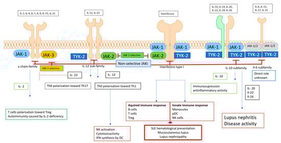 Type I interferons play a crucial role in the development of SLE; thus, the inhibition of JAK attached to an IFN receptor may explain the therapeutic effects of JAKis. IL-2, a cytokine belonging to the γ chain receptor family, is responsible for Treg development; therefore, it exerts an anti-inflammatory effect that may be blocked by IL-23. Typical proinflammatory cytokines of the IL-12 family are responsible for the polarisation of Th cells toward Th1 and Th17. As the direct peripheral role of these cytokines is unknown, the inhibition of this pathway is probably indirect (blocking inflammatory Th1 and Th17 response). The IL-10 family receptor transmits both anti-inflammatory (IL10) and pro-inflammatory signals (IL-20, IL-22 and IL-26). Therefore, JAKi administration may exert a therapeutic effect when predominantly proinflammatory cytokines are inhibited.