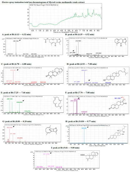 Base peak chromatogram of myrrh resin methanolic extract and identification of secondary metabolites, which are: 4,5-dihydrofuranodienone (A), furanodienone (B), mansumbinone (C), cembrene-A (D), campestan-3b-ol (E), pregnadiene (F), Z,4Z-furanodien-6-one (G), guggulsterol (H), 3,4-seco-mansumbinoic acid (I). Meas m/z, measured m/z.
