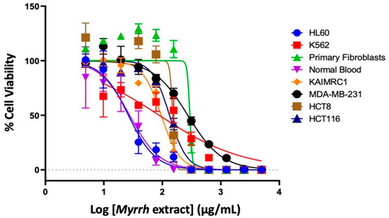 The U.S. National Cancer Institute (NCI) has established criteria of in vitro cytotoxicity for crude extracts in preliminary assays, which is an IC50 value of less than 30 μg/mL. In this experiment, we sought to determine the cytotoxic activity of myrrh resin extract in breast cancer cell lines (MDA-MB-231 and KAIMRC1), colorectal cancer cells (HCT8 and HCT116), leukemia cell lines (HL60 and K562), and control cells: normal primary fibroblasts and normal blood (P1 and N1) [58]. Cells were treated with various concentrations of myrrh extract to generate a functional dose–response curve, from which the IC50 (µg/mL) value for each cell line was calculated (Figure 2). We categorized the IC50 values as potent cytotoxic effect (IC50 < 10 μg/mL, moderate cytotoxic effect (IC50: 11–100 μg/mL), and poor cytotoxic effect (IC50 > 100 μg/mL).