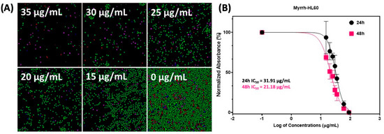 Treatment of leukemic HL60 cell line with myrrh extract. (A) High content imaging of treated cells at 48 h. The cell health module was used to identify live (green), pre-apoptotic (blue), post-apoptotic (pink), and dead (red) cells. (B) Cell viability was assessed by TiterGlo™ assay at 24 h and 48 h. Five points, i.e., 35, 30, 25, 20, and 15 µg/mL serial dilution, were used to calculate the IC50 values (shown in the figure). The X-axis presents the log of myrrh concentration in µg/mL, and the Y-axis represents the percentage cell viability.
