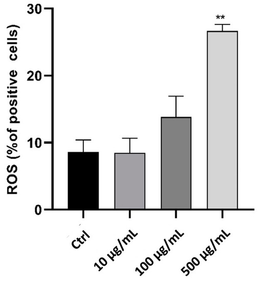To examine the effect of myrrh extract on inflammatory cells, we used the phagocytic human leukemic monocytic cell line, Tamm-Horsfall Protein 1 (Thp-1)-like macrophage cells, which can differentiate into macrophage-like cells by the activation of protein kinase C upon treatment with PMA. These cells are readily used as a model to study monocyte/macrophage functions and their signalling pathways. We used Annexin V staining to identify the effect of myrrh extract treatment on apoptosis, as shown in Figure 4. Treatment with 100 μg/mL significantly increased the percentage of apoptotic cells (p < 0.05). Since oxidative stress plays a crucial role in the pathophysiology of different diseases and modulates cell function and structure, we measured ROS to test whether myrrh treatment impacted the oxidant/antioxidant balance and generated ROS in Thp-1 cells [69,70]. Our results showed a dose-dependent increase in ROS following 100 μg/mL treatment with myrrh, and a significant increase was observed at the highest concentration tested, 500 μg/mL (p < 0.01) (Figure 5).