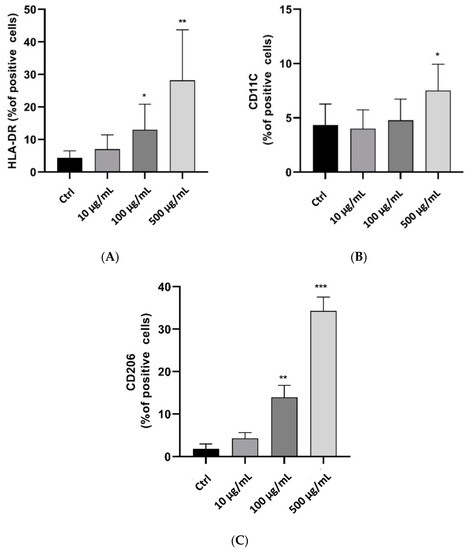 In addition, phenotypic changes and plasticity are significant characteristics of Thp-1-like macrophage cells. Differences in exogenous stimulators secreted by other cells or components of the microenvironment can influence their final phenotype. Our findings showed that treatment with myrrh increased both M1-like-phenotype markers, human leukocyte antigen–DR isotype (HLA-DR) (27%) and CD11C (12%) (Figure 6A,B), and the M2-like-phenotype marker CD206 (33%) (Figure 6C); however, the percentage of M2-like cells was greater with treatments of 100 μg/mL and 500 μg/mL, indicating that the anti-inflammatory response was greater than the pro-inflammatory response with myrrh treatment. The increase in apoptosis may be related to the final effect of clearance, as is typically seen in vitro after polarization and response to inflammatory or infectious stimuli [74].