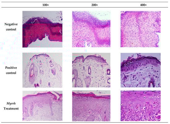 Histological alterations occur throughout the wound-healing process; thus we examined whether myrrh promoted a significant benefit in wound healing at the cellular level, as shown in Figure 8. In the wound treated with myrrh, the proliferation of fibroblast cells, epithelial degeneration, and normal epidermal cells were evident. Moreover, re-epithelialization and epidermal hyper-thickening in the wound area had occurred. In contrast, bepanthine demonstrated normal skin tissues with the removal of mild keratinized tissue. Furthermore, a dense layer of the epidermis grew with granular tissue that revealed cells and arteries filling the wound. On the contrary, the negative control revealed distributed inflammatory cells and bleeding, especially neutrophils within the loose connective tissue. The existence of immature granulation tissue indicates tissue injury with severe inflammatory cell diffusion, and the presence of inflammatory cells in the scar tissue was noted. During the normal process of wound healing, there is a phenotypic transition of the macrophages from the M1 pro-inflammatory to the M2 anti-inflammatory and pro-fibrotic type [82]. As described earlier, M2 cells promote the formation of the extracellular matrix and secrete PDGF required for angiogenesis and normal tissue function [83], and the depletion of macrophages is associated with delayed re-epithelialization, impaired angiogenesis, and diminished collagen formation [84]. Therefore, the effect of myrrh treatment is likely to be enhancing normal M2 function. Previous reports describe myrrh along with other herbal extracts to promote wound contraction fibrosis and wound healing in rats [85].