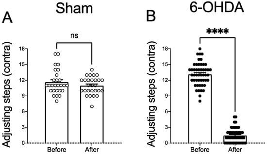 Evaluation of the stepping test before and after surgery for the unilateral vehicle or 6-OHDA infusion into the right MFB. (A) Administration of the vehicle into the right MFB bundle did not affect the stepping test (p > 0.05; paired t-test). (B) 6-OHDA microinjection into the right MFB significantly decreased the number of adjusting steps performed with the contralateral forelimb (**** p < 0.0001; paired t-test). Data expressed as mean ± SEM. Results are derived from a total of n = 23 Sham-operated and n = 51 6-OHDA-lesioned rats.