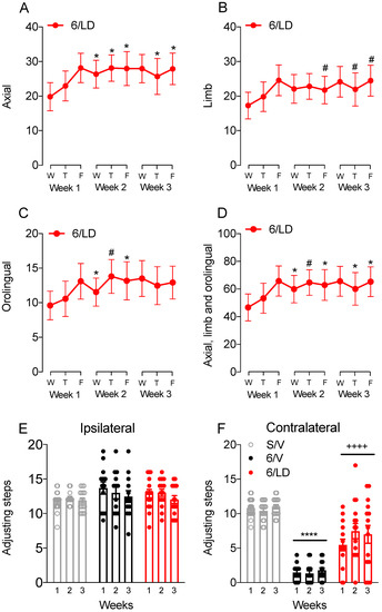 Effects of chronic L-DOPA administration on AIMs and stepping test. The temporal profile of (A) axial, (B) limb, (C) orolingual, and (D) sum of axial, limb, and orolingual AIMs is detailed for each week of chronic L-DOPA treatment. The analysis revealed that L-DOPA increased the incidence of AIMs throughout chronic administration (# p < 0.10, * p < 0.05 vs. Wednesday on Week 1, one-way RM-ANOVA and Holm-Sidak post-hoc test). L-DOPA had no effect on the stepping test performed with the (E) ipsilateral forelimb and partially improved stepping test performance with the (F) contralateral forelimb (**** p < 0.001 vs. S/V group, ++++ p < 0.001 vs. 6/V group). Data expressed as mean ± SEM. Results are derived from n=17 animals in the S/V group, n = 13 in the 6/V group, and 15 in the 6/ LD group. Abbreviations: W = Wednesday, T = Thursday, F = Friday.