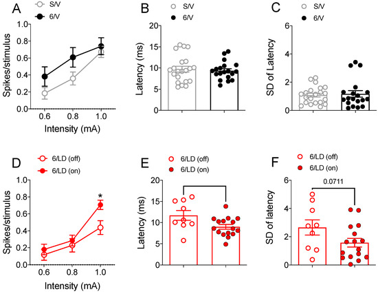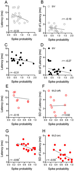 Spike probability and the latency to the first spike correlate in LID. (A–F) There was no correlation between the latency to the first spike and spike probability or the standard deviation of latency to the first spike and spike probability in the S/V, 6/V, and 6/LD groups (p > 0.05, Pearson’s r). (G) There was a negative correlation between the latency to the first spike and spike probability and (H) a negative correlation between the latency to the first spike and spike probability (* p < 0.05, Pearson’s r). Results are derived from n = 10/21 animals/cells in the S/V group, n = 6/19 animals/cells in the 6/V group, and 12/9-–16 animals/cells in the 6/ LD group.