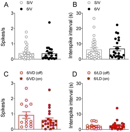 The firing rate and the interspike interval were recorded in spontaneously active putative MSNs (Figure 5). There was no difference between firing rates (t(49) = 0.13, p > 0.05; Figure 5A) or interspike interval (t(49) = 0.32, p > 0.05; Figure 5B) of spontaneously firing striatal MSNs in sham-operated and 6-OHDA-lesioned groups. Although firing rate was higher and interspike interval was shorter in the 6/LD group (compared to S/V and 6/V groups), there was no difference between firing rates (t(34) = 1.37, p > 0.05; Figure 5C) or interspike interval (t(34) = 0.38, p > 0.05; Figure 5D) of spontaneously firing striatal MSNs recorded before (off) L-DOPA and after (on) L-DOPA administration.