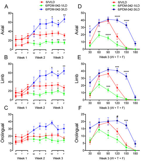 The second cohort of animals was used to investigate the effects of the PDE10A inhibitor PDM-042 on the incidence of AIMs. The results demonstrated that the effects of PDM-042 on AIMs were dose-dependent. Two-way RM-ANOVA revealed significant interactions between time and drug treatment for the analysis of total axial (F(16,144) = 3.83, p < 0.0001; Figure 6A) and limb AIMs (F(16,144) = 3.69, p < 0.0001; Figure 6B). Post-hoc comparisons revealed that chronic administration of the PDM-042 at a lower dose (1 mg/kg) attenuated axial (Figure 6A) and limb (Figure 6B) AIMs at the second (Wed) and third (Wed, Thu, and Fri) week of chronic treatment (p < 0.05 vs. V/LD group). Chronic administration of the PDM-042 at a higher dose (3 mg/kg) increased axial (Figure 6A) and limb (Figure 6B) AIMs during the third week (Wed, Thu, and Fri) of chronic treatment (p < 0.05 vs. V/LD group). Although there was no significant interaction between time and drug treatment for the analysis of total orolingual AIMs (p > 0.05; Figure 6C), there was a significant main effect of treatment (F(16,144) = 1.36, p < 0.001). Post-hoc comparisons for main effects revealed that PDM-042 1 mg/kg did not interfere (p > 0.05 vs. V/LD group) with orolingual AIMs but PDM-042 3 mg/kg increased orolingual AIMs (p < 0.05 vs. V/LD group).