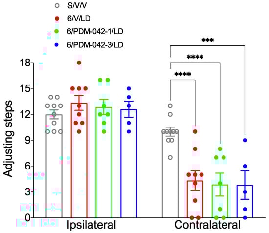 The stepping test was performed on the third week of chronic treatment to evaluate whether PDM-042 interferes with the antiparkinsonian activity of L-DOPA (Figure 7). Two-way RM-ANOVA revealed an interaction between the drug treatment and forelimb side (contralateral and ipsilateral) (F(3,27) = 6.48, p < 0.01). The post-hoc analysis revealed no interference of drug treatment on the number of adjusting steps performed with the ipsilateral forelimb (p > 0.05, Figure 7, left). The post-hoc analysis also revealed a partial antiparkinsonian activity of L-DOPA on the number of adjusting steps performed with the contralateral forelimb (Figure 7, right) in the 6/V/LD group (p < 0.01 vs. S/V/V group). Chronic administration of PDM-042 (1 and 3 mg/kg) did not interfere with antiparkinsonian activity of L-DOPA (p > 0.05 vs. 6/V/LD group). It is worth noting that few animals could not step during the test because they were dyskinetic when the test was conducted (Figure 7, right).