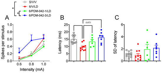 We attempted to determine the impact of chronic PDM-042 administration on cortically evoked spike activity and spike latency in putative striatal MSNs recorded in the ipsilateral striatum (Figure 8). Two-way RM-ANOVA analysis revealed an effect for both drug treatment (F(3,31) = 3.45; p < 0.05) and current intensity (F(2,62) = 41.97; p < 0.0001), but there was no interaction between drug treatment and current intensity (F(6,62) = 1.65; p > 0.05) on spike probability (Figure 8A). The post-hoc analysis for the main effects of drug treatment revealed that the higher dose of PDM-042 (3 mg/kg) facilitated corticostriatal transmission (p < 0.05 vs. S/V/V and 6/PDM-042-1/LD groups; Figure 8A). Because cortical stimulation with 0.6 mA failed to elicit consistent responses in MSNs, we investigated the effects of cortical stimulation on the spike latency at 1 mA current intensity (Figure 8B). One-way ANOVA revealed significant differences in spike latency between treatment groups (F(3,31) = 8.81; p < 0.001). The post-hoc analysis revealed that dyskinetic animals had a shorter spike latency (p < 0.05 vs. S/V/V group). PDM-042 (1 and 3 mg/kg) prevented L-DOPA-induced reduction of spike latency (p > 0.05 vs. S/V/V group). There was no difference in the standard deviation of spike latency between groups (F(3,31) = 2.48, p > 0.05, Figure 8C).