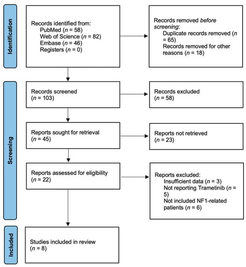 The following studies were excluded:(1) abstracts, letters, expert opinions, and reviews; (2) studies with no reported outcomes of interest; (3) studies with insufficient data to extract; (4) studies reporting MEK inhibitors other than trametinib or combined use of trametinib with other therapies in the treatment of NF1 patients.