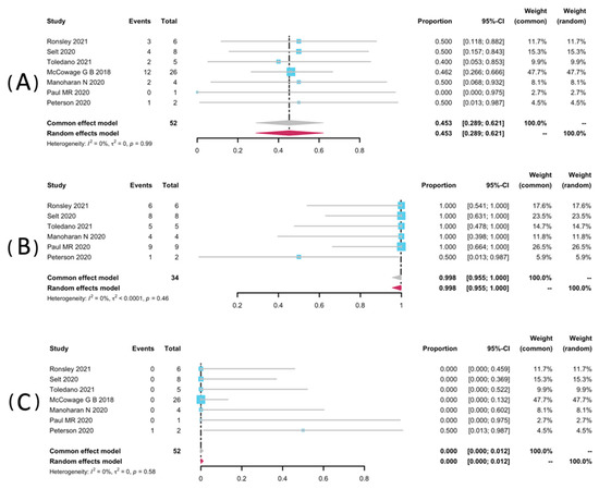 Volumetric analyses of 52 patients in seven studies [25,32,33,34,35,36,38] were extracted to pool the ORR, and 34 patients from six studies were analyzed for DCR [25,32,33,34,36,38]. The result of pooled ORR is 45.3% (95% CI: 28.9–62.1%) with no significant heterogeneity (p = 0.99, I2 = 0%). The pooled DCR was 99.8% without significant heterogeneity (p = 0.46, I2 = 0%). Among the included studies, disease progression was observed in only one study (1/2, 50%), yielding a pooled rate of zero (95% CI: 0.0–0.01%, I2 = 0%) [25]. The forest plots of pooled ORR, DCR, and progression rate were presented in Figure 2. Subgroup analyses were undertaken by including only patients with pNFs (Figure 3) and LGGs (Figure 4). The overall result remains steady with the ORR of 42.9% (95% CI: 23.0–63.8%, I2 = 0%) and 44.2% (95% CI: 22.7–66.9%, I2 = 0%), and the DCR of 100% (95% CI: 90.7–100.0%, I2 = 0%) and 99.2% (95% CI: 90.2–100.0%, I2 = 0%), respectively.
