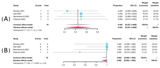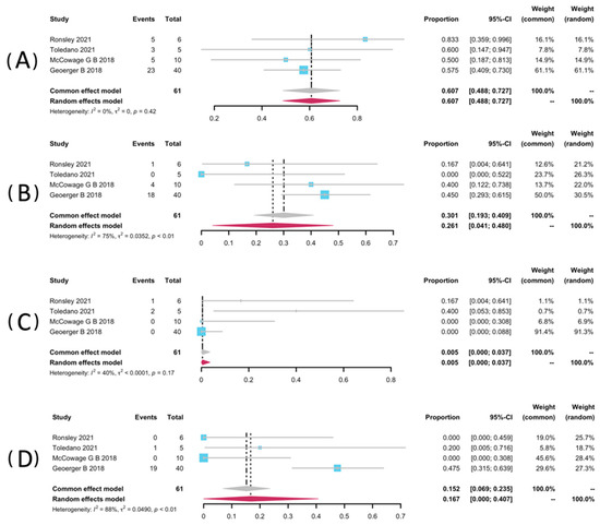 Restricted to NF1-related patients, data of AEs of any grade were pooled from four studies [32,34,35,37]. Among these three studies, they used Common Terminology Criteria or Adverse Events (CTCAE version 4.0) [34,35,37], and another one used version 5.0. Data from five studies were not pooled for the safety analyses because they did not report NF1-related patients as a separate group [25,33,36,38]. AEs analyzed include rash, paronychia, and diarrhea. The most frequent AE was any grade of paronychia, with a pooled rate of 60.7% (95% CI: 48.8–72.7%, I2 = 0%). It is worth mentioning that Ronsley et al. and Toledano et al. each reported a case requiring revision or discontinuation of a treatment regimen resulting from severe paronychia [32,34]. Selt and co-workers reported an occurrence of 7/18 (38.9%) of paronychia during the trametinib treatment among LGG patients with-or-without NF1 [33]. The prevalence of all grades of rash was 26.1% (95% CI: 19.3–40.9%, I2 = 75%). It was also close to that in Selt’s study, which was 27.8% (5/18) [33]. In addition, diarrhoea presented a pooled rate of 16.7% (95% CI: 0.00–40.7%, I2 = 88%). In addition, the pooled rate of mouth ulcer was 0.5% (95% CI: 0.0–3.7%, I2 = 40%). The pooled forest posts of AEs are presented in Figure 5.
