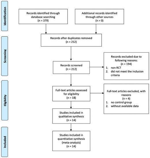 Figure 1 demonstrates the literature selection process that was conducted in this study. During our initial literature search, 379 potentially eligible studies from PubMed, Web of Science, and Cochrane Library were found. A total of 167 duplicated studies were removed. The remaining 212 studies were meticulously screened according to the abstracts, and 194 of them were removed according to the following criteria: non RCTs, and those RCTs, which did not meet our inclusion criteria. Eighteen studies that had the potential for inclusion and their full texts were reviewed. Four studies were subsequently removed as they did not have control groups and data were not available. Finally, 14 RCTs were included in this systematic review and meta-analysis manuscript.