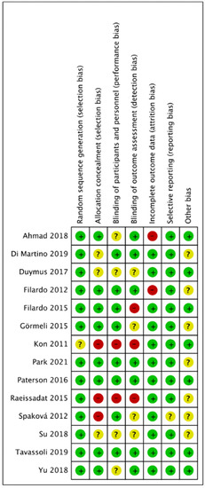 Figure 2 and Figure 3 presented the risk of bias. One study did not report methods of random sequence generation [11]. Eight studies reported allocation concealment [9,13,14,16,18,20,21,22]. Eight studies reported blinding of participants and personnel [9,10,12,13,14,16,20,21,22], and seven studies reported blinding of outcome assessors [9,10,16,18,20,21,22]. In total, five studies were double-blinded [9,10,16,21,22].