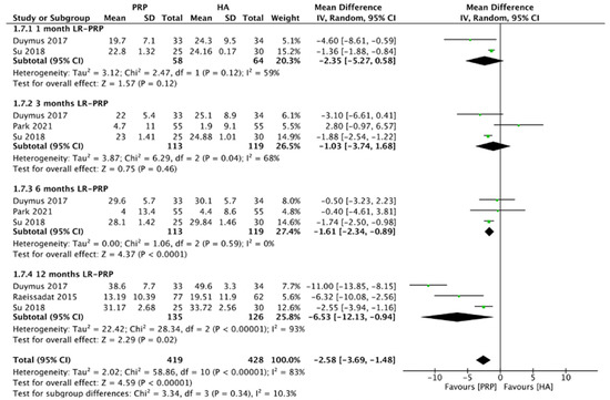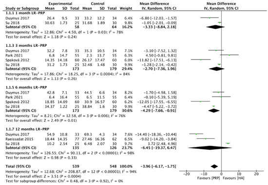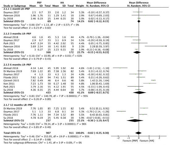 Figure 8 showed the comparison of LR-PRP and HA injection to the knee joints according to the VAS score. Due to the heterogeneity between trials being significant (I2 = 95%, p < 0.00001), the random-effect model was used. No significance of VAS score between LR-PRP injection compared to HA injection (MD = −0.02, 95% CI −0.35 to 0.30, p = 0.88) was found. A total of three RCTs reported VAS score at 1 month after injection (I2 = 0%, MD = 0.02, 95% CI: −0.12 to 0.15, p = 0.82) [16,17,19]; five studies reported VAS score at 3 months after treatment (I2 = 63%, MD = −0.15, 95% CI: −0.53 to 0.22, p = 0.43) [16,17,18,19,22]; 8 studies reported VAS score at 6 months after treatment (I2 = 95%, MD = 0.09, 95% CI: −0.57 to 0.75, p = 0.8); [10,11,13,14,17,18,19,22]; 4 studies reported VAS score at 12 months after treatment (I2 = 96%, MD = −0.36, 95% CI: −1.19 to 0.47, p = 0.4 [10,13,17,19]. We also performed the subgroup analysis and demonstrated that the VAS scores of the LR-PRP group showed no significance at 1, 3, 6, and 12 months after injection, compared to the HA group.