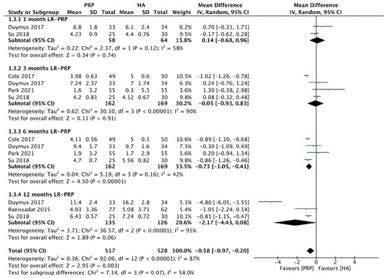 In conclusion, this is the first meta-analysis that demonstrated that IA LR-PRP injection showed better overall outcomes as compared to IA HA injection in patients with knee OA at 3-, 6-, and 12-month follow-up periods, in terms of WOMAC pain scores, WOMAC physical function scores, WOMAC total scores, and IKDC scores. LR-PRP injection offers a better overall treatment outcome as compared with HA in knee OA patients. As a result, IA LR-PRP injections offer better outcomes in treating knee OA patients, as compared with HA during both short-term and long-term follow-up periods.