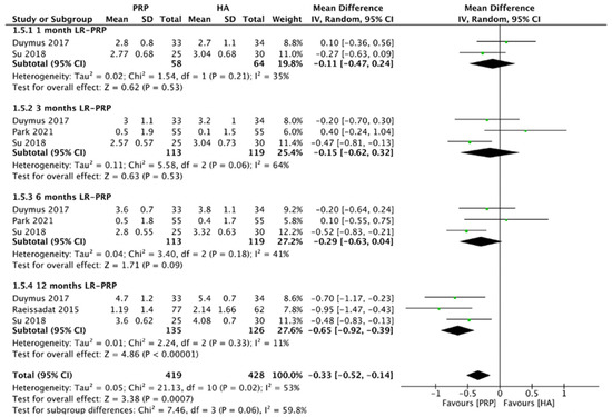 When it comes to the frequency of PRP treatment, most of the included trials received three consecutive LR-PRP injections [9,10,11,12,13,14,16,18]. In a further literature search, we have discovered four studies that received two LR-PRP injection treatments [15,17,19,21]. One study received four consecutive LR-PRP injections [20]. One study has mentioned the treatment effectiveness after receiving only one LR-PRP injection [22]. Due to insufficient trials, it is difficult to perform subgroup analysis to further arrive at the conclusion as to which frequency can offer the best treatment outcome.
