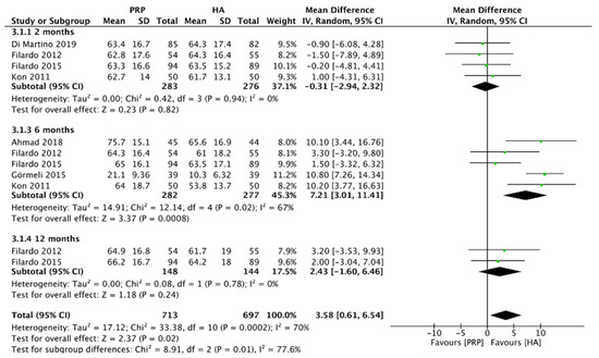 Figure 9 showed the comparison of LR-PRP and HA injection to the knee joints according to the IKDC score. Due to the heterogeneity between trials being significant (I2 =70%, p = 0.0002), the random-effect model was used. The results showed that the HA injection was associated with a decrease in the IKDC score as compared to LR-PRP injection (MD = 3.58, 95% CI 0.61 to 6.54, p = 0.02). A total of three RCTs reported IKDC score at 2 months after injection (I2 = 0%, MD = −0.31, 95% CI: −2.94 to 2.32, p = 0.82) [9,10,13]; 5 studies reported IKDC score at 6 months after treatment (I2 = 67%, MD = 7.21, 95% CI: 3.01 to 11.41, p = 0.0008) [9,11,13,14,18]; 2 studies reported IKDC score at 12 months after treatment (I2 = 0%, MD = 2.43, 95% CI: −1.6 to 6.46, p = 0.24) [9,13]. We also performed the subgroup analysis and demonstrated that the IKDC score of the LR-PRP group was significantly different at 6 months after injection, compared to the HA group.