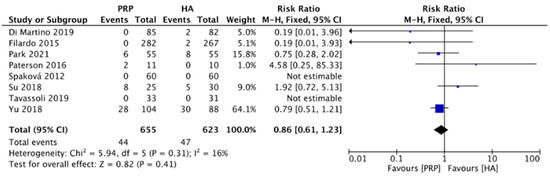 Figure 10 compared the adverse effects between the LR-PRP and HA groups on knee OA in 8 RCTs [10,12,13,16,19,20,21,22]. The most common adverse events were worsening knee pain and swelling, vomiting, and fatigue. No major adverse events were reported in both groups. The heterogeneity test showed mild heterogeneity (I2 = 16%), thus the fixed-effects model was chosen. The results found no significance between LR-PRP and HA groups (RR: 0.86, 95% CI: 0.61 to 1.23, p = 0.41). The result indicated that LR-PRP and HA had similar safety profiles.