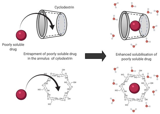 Mechanism for cyclodextrin-enhanced solubility of poorly soluble drugs through entrapment and complex formation with the drug molecule.