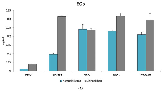 Concerning hemp and hop Hys, EC50 values were 6.05 mg/mL and 4.90 mg/mL, respectively. Likewise, low EC50 values were obatined for the treatment of SH-SY5Y cells (4.90 mg/mL for hemp and 10.46 mg/mL for hop). Higher EC50 values for the corresponding treatment on MCF-7 and MDA cells were obtained (Table 4). Figure 2 shows the bar graphs of the EC50 values of EOs (Figure 3a) and Hys (Figure 3b) obtained from Kompolti hemp and Chinook hop.