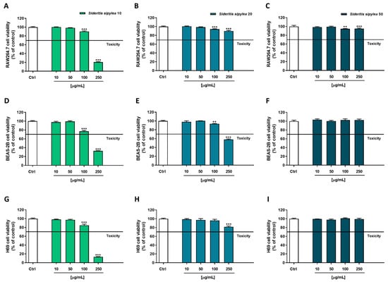 Cytotoxicity of S10, S20, and S50 fractions from Sideritis sipylea Boiss in nonmalignant mouse macrophages RAW264.7 (A–C), human bronchial epithelium BEAS-2B cells (D–F), and human intrahepatic cholangiocytes H69 (G–I) determined by Neutral Red assay after 24 h exposure. Data displayed as mean ± SE of at least three technical replicates from two experiments (n = 3). ** p < 0.01 and *** p < 0.001 vs. control (one-way ANOVA followed by Dunnett’s multiple comparison post-test).