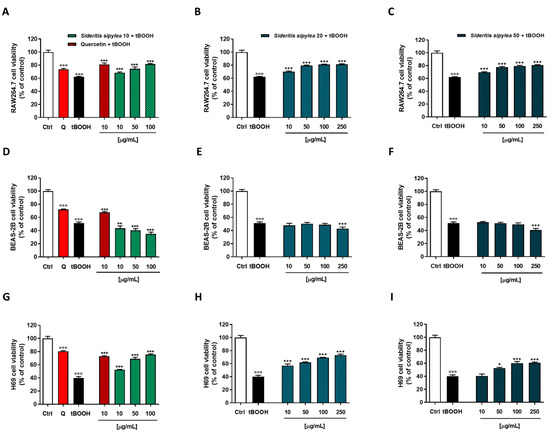 The MTT assay highlighted that our cellular models had a different sensitivity to the damage from tBOOH: H69 normal cholangiocytes were the most sensitive with a reduction of cell viability by about 60%, while inhibition of cell viability by about 38% and 49% was observed in RAW264.7 and BEAS-2B, respectively. As expected, the positive control quercetin at the nontoxic concentration of 10 µg/mL was able to counteract the oxidative damage of tBOOH; indeed, the cell viability increased by about 19%, 16%, and 33% in RAW264.7, BEAS-2B, and H69 cells, respectively (Figure 5).