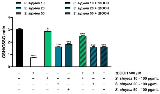 Considering that tBOOH detoxification takes place through conjugation with reduced glutathione (GSH) so generating oxidized glutathione (GSSG), the possible modulation of this target by S. sipylea fractions was investigated too. As expected, the pro-oxidant agent highly reduced the GSH/GSSG ratio by about 4-fold, meaning that GSH was depleted in favor of GSSG generation (Figure 9).