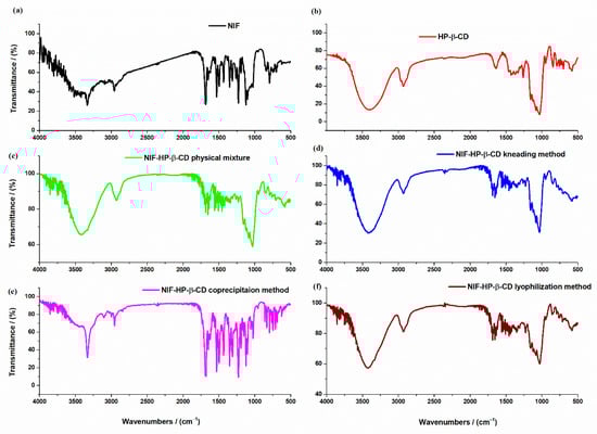 FTIR spectra of NIF, HP-β-CD, NIF-HP-β-CD physical mixture and NIF-HP-β-CD inclusion complexes obtained using the kneading, coprecipitation and lyophilization methods are represented in