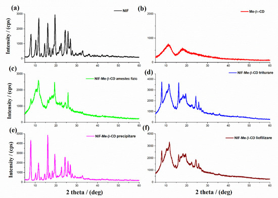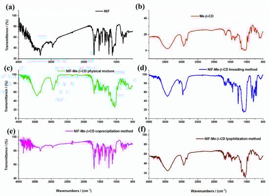 Figure 3f) methods is an indication of strong interactions between NIF and cyclodextrin compounds and the possible complexation by the inclusion of the drug into the Me-β-CD cavity. All these changes observed in the FTIR spectra of NIF-HP-β-CD and NIF-Me-β-CD compounds obtained using physical and chemical methods of complexation, such as the shift in the absorption peaks or their decrease in intensity, even the whole disappearance is evidence of the various degrees of interaction or amorphization in different products [