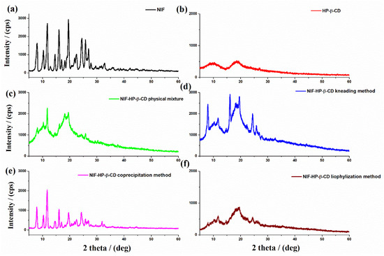 Figure 6e), the presence of the characteristic peaks of the pure NIF and HP-β-CD compounds are observed. This is a confirmation that the complexation between the two compounds did not occur. A possible interaction between them is still evidenced due to the reduction in the intensities of the diffraction peaks. In contrast, in the NIF-HP-β-CD systems obtained using kneading (