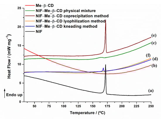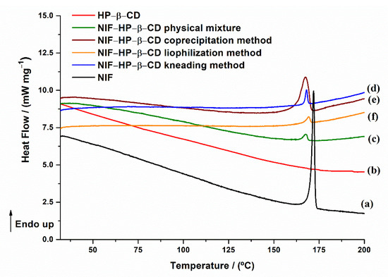 Figure 8f), which indicates an interaction between the two components. The DSC results indicated that NIF was successfully incorporated into the HP-β-CD cavity in the case of the lyophilization product. Generally, when guest molecules are partially or totally included in the cyclodextrin cavity, their sublimation, boiling or melting temperatures are shifted to different temperatures or disappear [
