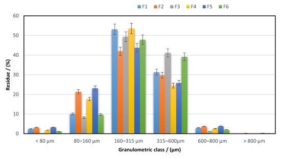 45]. The studied formulations display different granulometric properties, with similar behaviour between F3 and F6 on one side and the other four (F1, F2, F4 and F5) on the other side. The materials based on the silicified microcrystalline cellulose and Disintequik™ ODT mixture have a considerable proportion of the particles with sizes between 160 and 600 µm, above 90% for F3 and almost 87% for F6, showing a narrower range for all proposed formulations. Meanwhile, F2 and F5, which contain F-Melt