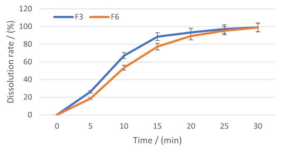 After 30 min, the tablets released the entire quantity of nifedipine contained (99.11% for F3 and 98.79% for F6), proving that both formulations lead to fast-dissolving tablets with excellent dissolution rate. Still, the differences between the formulations’ performances are obvious. Even after the first 5 min, it is observed that F3 has a higher dissolution rate of 26.15%, compared to 18.57% for F6, and this behaviour is maintained during the first 20 min, then F6 reaches similar release degrees.