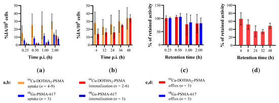 64Cu-DOTHA2-PSMA cellular uptake and internalization (a) in comparison with 68Ga-PSMA-617 up to 2 h p.i. and (b) without comparison, up to 48 h p.i. (c) 64Cu-DOTHA2-PSMA retention in comparison with 68Ga-PSMA-617 up to 2 h p.i. and (d) up to 48 h p.i. in human adenocarcinoma cells expressing PSMA (LNCaP). 68Ga-PSMA-617’s uptake up to 2 h p.i. was significantly lower than 64Cu-DOTHA2-PSMA’s (a, p < 0.001), with no significant difference in internalization and efflux.