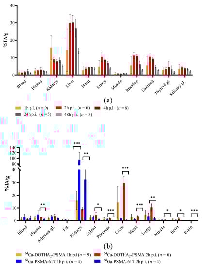 (a) 64Cu-DOTHA2-PSMA biodistribution of non-tumor-bearing balb/c mice up to 48 h p.i. and (b) in comparison with 68Ga-PSMA-617. Complete, numerical data are presented as Supplementary Materials. For clarity, only significant differences are shown in (b). *: p < 0.05, **: p < 0.01, ***: p < 0.001.