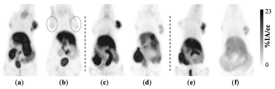 Representative maximal intensity projections of 64Cu-DOTHA2-PSMA PET in LNCaP tumor-bearing mice without (a,c,e) and with (b,d,f) the co-injection of natCu-DOTHA2-PSMA as a blocking agent. (a,b) Average frames from 40 to 60 min p.i. from dynamic scans; (c,d) 4 h p.i. 20 min static scan; (e,f) 24 h p.i 1 h static scan. The 1 mm3 3D Gaussian smoothing was applied for presentation only. Tumors are identified by circles in (b) only.