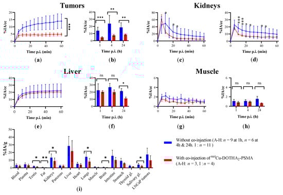 Liver uptake increased steadily and peaked at 4 h p.i. (26.8 ± 5.3% IA/cc). It was only significantly different with or without co-injection of blocking agent at 24 h p.i. (p = 0.04) (Figure 4e,f). Muscle uptake was stable from 5 min to 24 h p.i., between 1% and 2% IA/cc, without a significant difference between blocked and non-blocked injection.