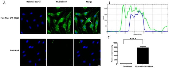 Peptides used for cellular and nuclear uptake experiments were fluoresceinylated at the N-terminus, enabling visualization through live cell fluorescence microscopy, as well as quantification by flow cytometry. The fluoresceinylated peptides were tested in conjunction with HFF cells, which were also used for the subsequent confocal imaging, cytotoxicity and virus neutralization assays. As some alpha-helical peptides, such as the hook peptide, have been shown to be able to penetrate membranes on their own [42,43], we examined translocation of the fluoresceinlyated hook peptide (Fluo-hook) lacking the CPP and NLS moieties, as well as the fluoresceinylated NLS-CPP-hook peptide (Fluo-NLS-CPP-hook). While Fluo-NLS-CPP-hook was efficiently taken up into the cells, as well into the nucleus (Figure 2A,B), internalization of Fluo-hook was significantly weaker, illustrating the strong effect of the translocation moieties in facilitating cellular and nuclear uptake of the hook peptide. This observation is in perfect agreement to recent studies, in which we have explored and proven the benefit of combining CPP and NLS for efficient drug delivery into the nucleus [44].