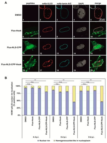 In order to quantitate this inhibitory effect, three areas of positive cells (192 cells on average, counted as technical triplicates), as contained on two biological replicates of slides, were used for evaluation. As a result, this microscopic inspection of cells clearly indicated a specific rim-disturbing effect of Fluo-NLS-CPP-Hook (Figure 3B), demonstrating a statistically significant reduction in the typical pUL53 nuclear rim localization towards a nucleoplasmic localization pattern (dot-like or homogeneous). This inhibitory effect increased over time of infection to 80%, 45% and 46%, respectively. The other two peptides only showed marginal effects that were not statistically significant (n.s.). Thus, these data indicate an inhibitory effect of the peptide Fluo-NLS-CPP-Hook on the NEC formation in HCMV-infected cells.