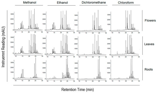 The investigation of this current study was initiated by chemical fingerprinting for the three plant parts of A. fragrantissima (i.e., flowers, leaves, and roots) using methanol, ethanol, dichloromethane, and chloroform. The solvents were chosen to represent the polar (i.e., methanol and ethanol), moderately polar (i.e., dichloromethane), and non-polar (i.e., chloroform) extractions that were reflected in the chromatograms. The chromatograms of methanol and ethanol extracts displayed more polar phytochemical constituents, which eluted first due to the separation using the reverse-phase C18 column while the least polar constituents appeared more abundant and eluted last in the chromatograms of dichloromethane and chloroform extracts. The numerous and abundant phytochemical constituents in the DMSO-reconstituted extracts also indicated the efficiency of the extraction method using the high-power probe sonicator, and that the abundant phytochemical constituents were retained after reconstitution with DMSO solvent. The rich phytochemical compositions observed in the chromatograms were consistent with studies that isolated and characterized numerous phytochemical constituents of A. fragrantissima plant’s parts using various techniques and identified several families of phytochemicals, including phenolic acids, flavonoids, lignans, terpenic lactones, and alkamides [18].