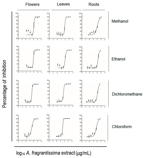 Approximately 500 mg of each dried A. fragrantissima flowers, leaves, and roots were extracted separately using 10 mL of high-purity methanol, ethanol, dichloromethane, and chloroform under high-power sonication using a Sonics (Newton, CT, USA) Vibra-Cell™ Ultrasonic Liquid Processor (Model GEX-130 probe-sonicator) for 30 min. The sonicated extract was filtered using a Sartorius stedim biotech (Göttingen, Germany) quantitative ashless paper filter under gravity-flow and dried in an incubator set at 40 °C. The remaining dried pellet residue was weighted and reconstituted with 100 to 300 µL of DMSO by vortex until completely dissolved. The reconstituted extract was stored at cool temperature in the dark until use. The averaged extraction yield percentage for the flowers-derived methanol, ethanol, dichloromethane, and chloroform solvent extracts were 30.3 (±4.2), 28.4 (±1.8), 13.4 (±0.6), and 22.5 (±1.3), respectively, the leaves-derived extracts were 34.3 (±5.1), 29.9 (±2.3), 18.9 (±4.0), and 30.2 (±2.1), respectively, and the roots-derived extracts were 9.5 (±1.1), 5.5 (±1.1), 2.4 (±0.2), and 7.7 (±0.9), respectively. The levels of endotoxins in the A. fragrantissima sonicated aqueous extracts were determined using the Thermo Scientific™ Pierce™ Chromogenic Endotoxin Quant kit as per the manufacturer’s instruction and as described in our previous publication [64].