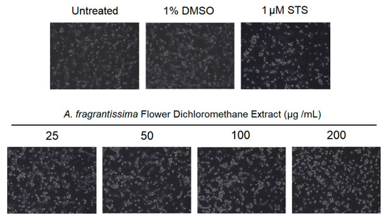 In vitro investigations were performed to determine if the inhibition of MDA-MB-231 cell growth was mediated via the caspase-dependent extrinsic apoptotic pathway. The treatment of MDA-MB-231 cells by the A. fragrantissima flower dichloromethane extract increased observed cell shrinkage in a dose-dependent manner, suggesting apoptosis as the mechanism of cell death (Figure 3). The caspase-dependent apoptosis was confirmed in A. fragrantissima flower dichloromethane extract-treated MDA-MB-231 cells presenting cleaved caspase-3/7; the active form indicated in red fluorescence and was determined under confocal fluorescence microscopy (Figure 4). The confocal images clearly display an increase in caspase-3/7 activity in the cells treated with the protein kinase inhibitor staurosporine (STS, a potent apoptosis inducer) and A. fragrantissima flower dichloromethane extract (25 to 200 µg/mL), in comparison with the untreated and DMSO-treated cells, the negative controls. The status of apoptosis was also determined using the FACS analysis based on the Annexin V/propidium iodide (PI) stain, which clearly showed early and late apoptotic status of A. fragrantissima flower dichloromethane extract-treated cells, in a dose-dependent manner, compared to DMSO-treated cells (Figure 5). The mitochondria potential membrane assay detected an increase in the number of apoptotic whole-cell green fluorescence indicating the involvement of the intrinsic apoptotic pathway in STS- and A. fragrantissima flower dichloromethane extract-treated cells, compared to the untreated and DMSO-treated cells (Figure 6).